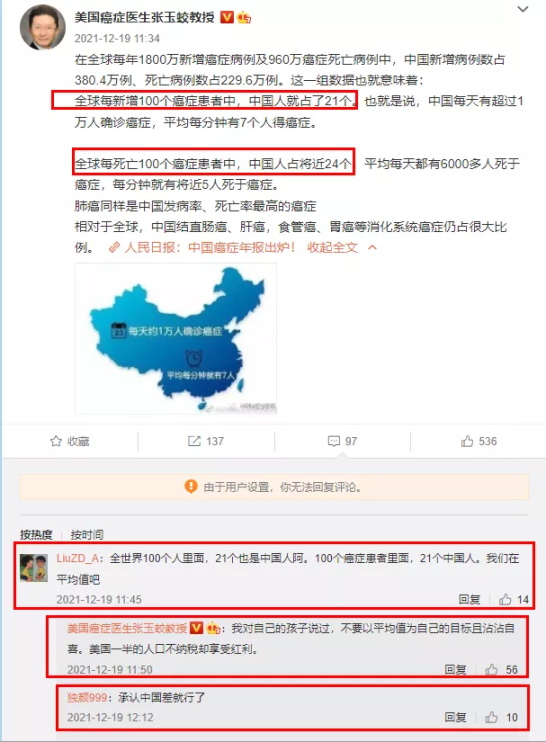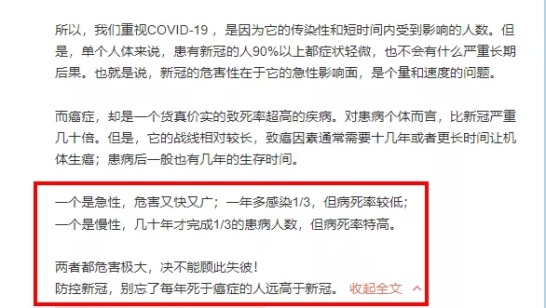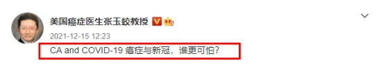 而他在北京时间去年12月15日的帖子,意图其实就已经暴露了。因为他居然想出了用癌症与新冠相对比的办法,得出所谓的“防控新冠,别忘了每年死于癌症的人远高于新冠”的结论。