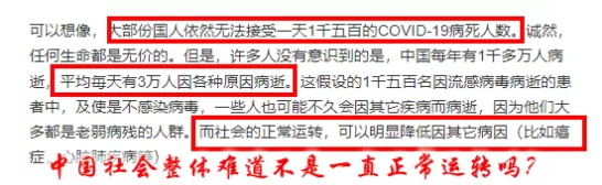 在文章中,这个美国医生称“大部分中国无法接受一天1500的病死人数”,可是却又是老套路,声称“中国平均每天有3万人因各种原因病逝”,然后声称“社会的正常运转可以明显降低其它病因死亡”。