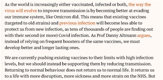 再次,人们误以为疫苗的接种工作已经完成了,所以现在应该放开了,比如英国的疫苗接种率就很高,尤其是老年人等弱势群体。然而,疫苗的保护力往往在几个月后就会逐渐消失,加强针虽然能提供更多帮助,但也需要时间去完成接种。与此同时,病毒也在继续变异,奥密克戎毒株就已经突破了之前疫苗构建的免疫防线,这意味着之前的疫苗产生的保护力已经不足够对抗新的疫情,不少二次感染的人就已经感受到了这个现实。所以,除了疫苗,眼下还需要其他防疫措施去减少疫情扩散。如果急着恢复常态,反而会导致更多对日常生活的扰乱,导致更多人发病,并给医疗资源造成更大的压力。