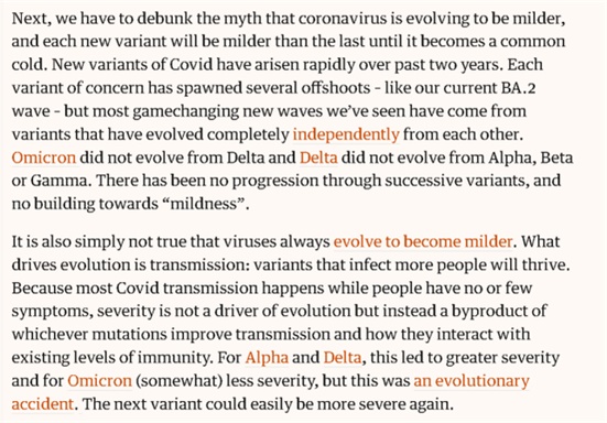 其次,人们认为新冠病毒的变异路径一定是“越变毒性越轻”的,误以为新冠病毒的毒株最终会变异成接近普通感冒的水平。可问题是,奥密克戎毒株并不是从德尔塔毒株变异过来的,而是独立变异的,就像德尔塔毒株也不是从阿尔法毒株变异过来的一样,这些毒株之间并不存在变异上的继承关系。同时,病毒毒株在人群中的变异并不都是越变毒性越弱的,因为决定毒株变异因素的并不是毒性,而是传染性,毒性只是这种变异过程中的一个副产物。换言之,奥密克戎的毒性偏弱以及德尔塔的毒性偏强,其实都是病毒在变异过程中随机出现的,所以不排除下一种新出现的毒株反而毒性会比奥密克戎更强。
