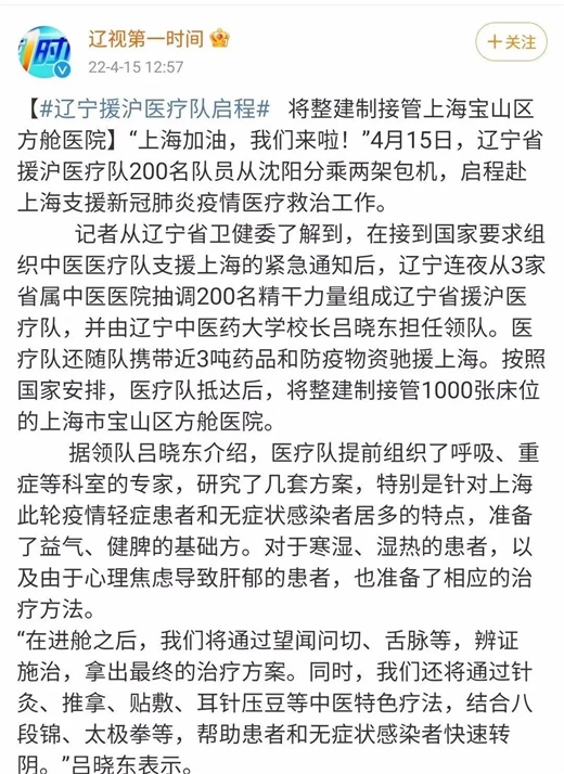 导读:魔都动态清零即将迎来转折的关键时刻,当此之时,多省紧急组建援沪中医医疗队,整建制接管方舱医院,为阻断疫情、拯救病患贡献着自己的力量。截至18日,魔都本轮累计阳性病例38万余人,其中确诊病例27613例,重症21例,死亡10例。虽然通告里都是几乎都是伴随基础病的老年人,他们的去世已经被归结为了die with ,然而47.62%的重症死亡率,这数据如果准确的话,只能说,这重症死亡率着实让人触目惊心。这个时候,我们才明白,为什么孙春兰副.总.理一到当地就反复强调尽锐出战。这个时候,再回看前几天的信息,我们才发现,原来危机已经到了刻不容缓的地步了。一方面是西医重症团队成建制紧急驰援当地。据不完全统计,西医“重症八仙”早早就去了两位;稍早一点,本月7日,福建就派出了重症医护,而那个时候,当地还没有对外通报重症病例。还有,武汉同济协和(见上图)、武汉同济、华西等院都于近日派出了自己的重症团队。此外,14日陕西调配了3.38万ml康复者血浆紧急支援重症病例个位数的魔都,前不久陕西同样调配了2万ml康复者血浆紧急支援重症病例100人上下的吉林市。另一方面,刘清泉等中医专家也已经到了上海,据报道,他与张伯礼、仝小林、张忠德等国家中医医疗救治专家组成员,已就当地的中医药使用进行了两次研讨,并结合当地中医专家组的意见,提出了切合当地实际的中医药防治方案。与之配套的是,各地紧急组建中医团队,驰援上海,其方式是整建制接管方舱医院。笔者简单搜了一下,组建中医医疗队紧急驰援的包括但不限于辽宁、湖南、天津、河南、山东、陕西、河北、黑龙江、安徽、江西、四川、江苏等地。之所以紧急启用中医医疗队接管方舱医院兜底,其原因正是此前的实践证明了中医确实有效。我们可以简单回顾一下:1.转重率为零:比如,本月11日晚焦点访谈的介绍,正在香港支援的仝小林院士介绍:“我们做了721例轻型、普通型用中药干预和不用中药干预的相比,发现不用中药干预的那组转重率是6.5%,用中药干预的这组转重率是0,转重率明显不同。”又如,2020年武汉的江夏方舱医院,由张伯礼院士坐镇,一共收治564例轻型普通型,采用纯中医药救治模式,成功实现了零转重。当其它方舱也开始学着江夏方舱使用中医药后,整个方舱的转重率下降到了2%-5%。还有,在3月29日吉林的发布会上,长春中医药大学介绍了他们的经验,在接管了通源方舱医院、北湖方舱医院,九台区中医院后,采用纯中药治疗,病人服用中药后,截至当日无转重及危重型患者。对出院居家隔离患者,继续给予3天中药,巩固治疗效果,防止复阳。2.降低转阳率:扬州,去年七八月间的扬州,由南京来的老太在棋牌室引发,故老年患者比例偏高。据中国中医科学院西苑医院院长刘震介绍:观察了5686例密接,中药干预的,转阳率为0.86%,未进行中药干预的转阳率为1.73%。还是长春,长春中医药大学在yi.情最初就在校内开始运用中医药预防治疗,学校接管的通源方舱,全体医护均服用了预防中药。结果为学生中的密接和次密均未发现感染病例,医院也未发现院感。河南通许,2020年春,该县人民医院收治外地返乡发热患者25人,其中确诊4人,武汉返乡17人。在对不同人群分类服用不同中药预防,及时用艾条熏,尽对病人进行辨证施治,最终病人很快出院,且在防护物资极为紧张的条件下有效地预防了院感的发生。3.核酸转阴时间缩短:3月29日,吉林的发布会上,长春中医药大学介绍,在他们接管的方舱医院,采用纯中医药治疗后,1天退热率为72%,3天退热率为96%。症状消失的病人,从用药后第4天开始检测,按照间隔24小时的连续2次核酸检测阴性为出院标准,6天出院率均达到69%以上,住院时间明显缩短。西苑医院刘震在4月11日的焦点访谈介绍,2020年4月-7月,我国国家中医药管理局派出了三支中医医疗队(援助他国)。患者中核酸转阴的最短时间是4天,核酸转阴时间中位数是6天,取得了当地政府和百姓的广泛认可。4.后遗症问题:对于后遗症,目前,国内只有武汉早期的少数病患伴随长期后遗症。相比香港和国外,变量有二,一是严格的动态清零,身处其中的人缺少被反复感染的机会,二是,中医对患者的普遍的早期介入。一个佐证,非典期间,邓铁涛邓老的纯中医团队,与用激素治疗的某山院士团队,最终效果反差很大。前者很快康复回归正常生活,后者留下了伴随一生的股骨头坏死等症状。总而言之,正是因为预防作用明显,显著降低转重率,有效改善症状、缩短病程,且能减少后遗症并帮助愈后康复,这些被实践所反复检验的有效作用,中医自然就成了抗yi的有效利器。也正是如此,邓铁涛老先生的弟子,广州中医药大学的张忠德教授成了救火队长。从2020年初,两年多来,几乎是哪里有规模性的yi.情,他人就带队到了哪里,他的到来既是对中医使用的指导也是对包括重症患者在内的救治——他的第12次支援是在香港,那时魔都还声称没啥大问题自己能搞定呢。也正是在最近,据刘清泉的介绍,魔都方舱的中医使用率已经接近了100%,并且是分层分类,辨证施治。他还提到了,因为当地感染者终伴随基础性疾病的高龄老人不少,对他们而言,中西医结合既要关注新.冠.肺.炎,也要治疗基础性疾病。有效促进病人核酸转阴、阻断疾病的发展进程、减少重症,且简便易廉,这是中医的兜底作用。如果说武汉时的中医成建制接管江夏方舱属于实验