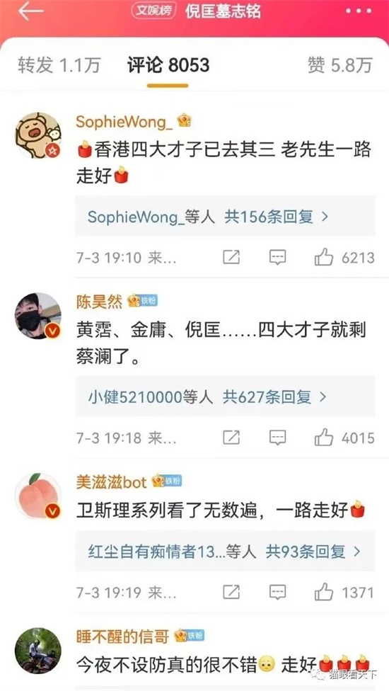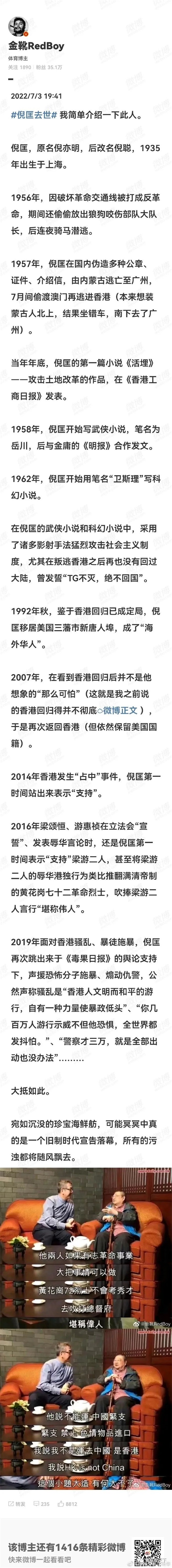 有意思,反贼在海外为倪匡点蜡纪念,内地网友在微博为倪匡点蜡。1957年逃港,终身拒绝踏入内地一步。他死了也会嘲笑那些哭他的内地网友。最有意思的是,倪某人在大陆时候就宛如无头苍蝇,一路潜逃至香港,九七之前又再次仓皇跑路,然后看香港没有清算,留着美国国籍再度跑回香港,在香港数次风波中各种言论都是延续他反革命路数,可称死不悔改。