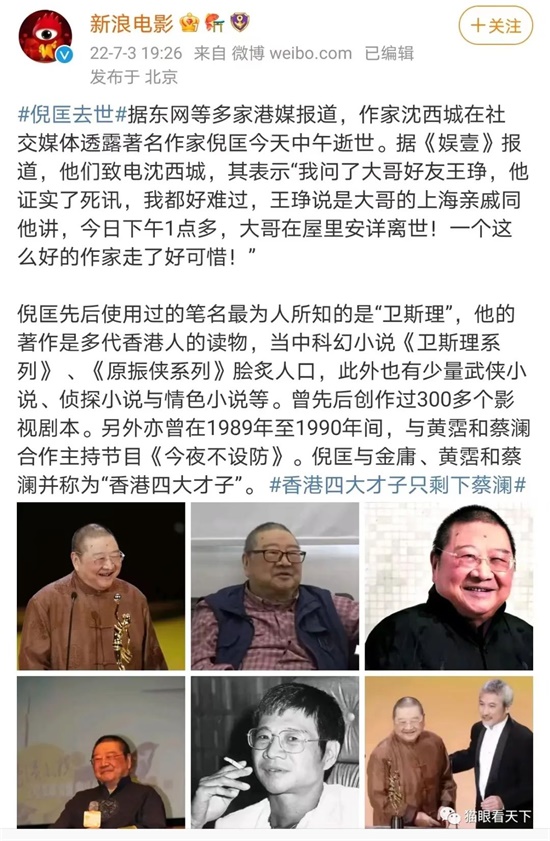 近日,一个叫倪匡的人死了,于是,某平台就开始炒作,试图让人们感觉他是个好人,是个才子。就差点给他当云孝子在网上设灵堂了。