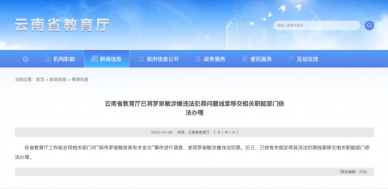 7月6日上午,云南省教育厅通报,经省教育厅工作组会同相关部门对“网传罗崇敏发表有关言论”事件进行调查,发现罗崇敏涉嫌违法犯罪。近日,已按有关规定将其违法犯罪线索移交相关职能部门依法办理。