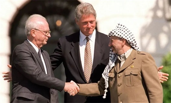 而以色列则承认巴勒斯坦国的存在,放弃暴力,放弃1967年之后所侵略的巴勒斯坦土地。在克林顿的见证下,分别代表巴勒斯坦和以色列的阿拉法特和拉宾握手言和,双方在14轮秘密谈判后于1993年在华盛顿签署了《奥斯陆协议》。