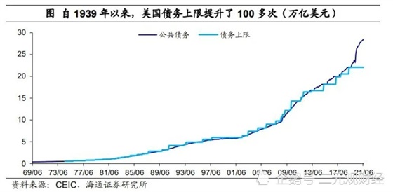 可以看出2000年之前美国债务提升的速度还是比较平缓的,但此后上升速度就越来越快。在2020年之后更是直线跳涨。|