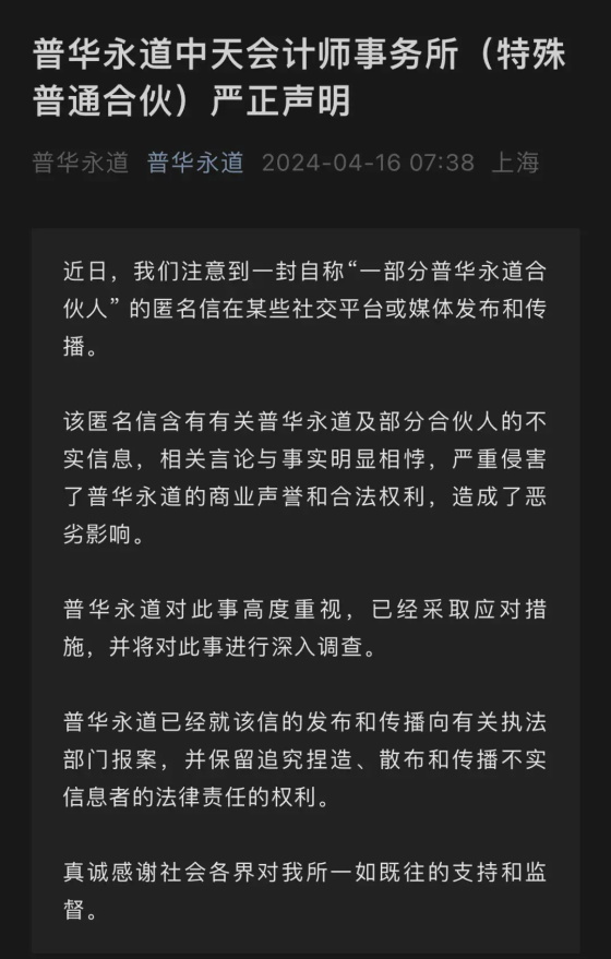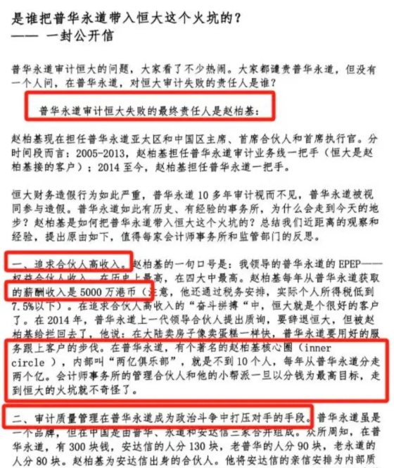 该匿名信将普华永道审计恒大失败的原因,归于赵柏基。匿名信还揭露了普华永道内部审计质量管理、人员打压等诸多问题。称普华永道内部有人曾指出恒大的审计存在问题,但指出问题的人“被解决掉了”。