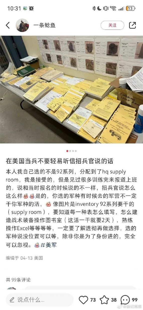 还有一个听从美军征兵官的话去美国加入了美军的中国人,在该平台上发帖给中国人说加入美军的经验。