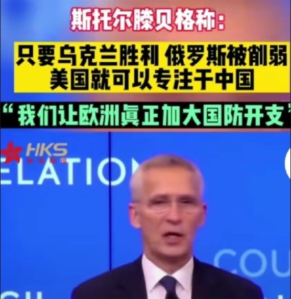 北约现任秘书长斯托尔滕贝格则扬言,只要乌克兰胜利,俄罗斯被削弱,美国就可以专注于中国。