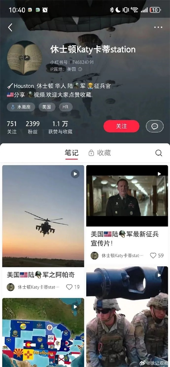 比如一个ID为958837547的账号,自称是一个美军的征兵官,分享美军的日常工作、生活和最新的资讯。其头像是一名美军女兵。