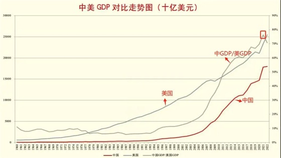 随着新冠的爆发,中国经济强大的韧性而美国经济遭受严重冲击的背景下,中国GDP总量一度占到了美国的76.4%,当时不少机构预测,中国将在2026到208年超越美国。
