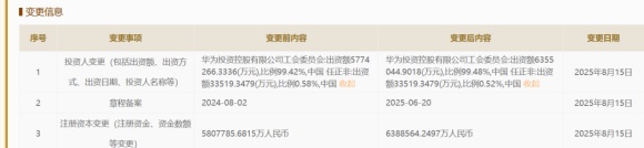 2025年的最新工商变更显示,华为投资控股的注册资本从约580.8亿元增加到638.9亿元,增幅为10%。但任正非的出资额保持不变,仍为33519.3479万元,但持股比例从0.58%降至0.52%。