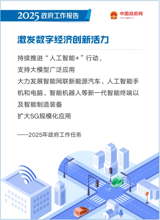 报告指出:持续推进“人工智能+”行动,将数字技术与制造优势、市场优势更好结合起来,支持大模型广泛应用,大力发展智能网联新能源汽车、人工智能手机和电脑、智能机器人等新一代智能终端以及智能制造装备。