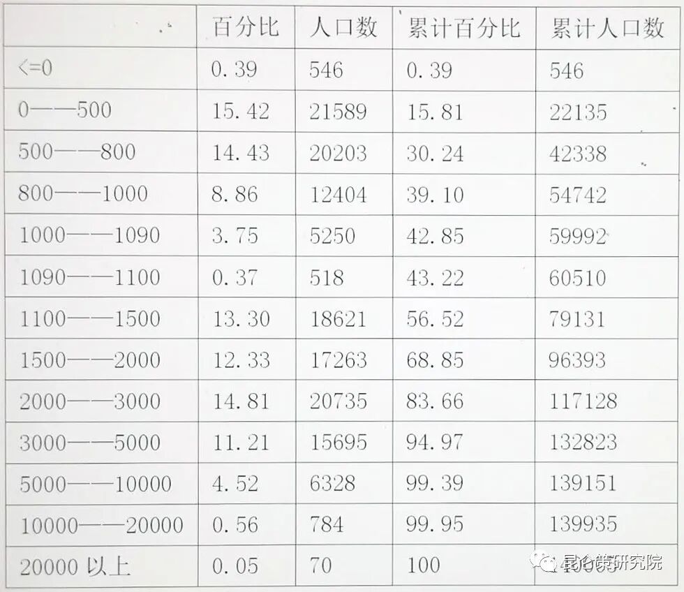 测算结果显示,中国有39.1%的人口月收入低于1000元,换算成人口数即为5.47亿人,同时月收入在1000-1090元的人口为5250万人,因此1090元以下的总人口为6亿人,占全国人口比重为42.85%。所以,正如总理所说的,约1000元(准确地说是1090元)以下的人口规模达到6亿人。在这6亿人中,有546万人没有任何收入,有2.2亿人月收入在500元以下,有4.2亿人月收入低于800元,有5.5亿人月收入低于1000元,有6亿人月收入低于1090元。如果以1090-2000元标准来界定中低收入者,则该群体的人口规模总量会达到3.64亿。按照世界银行的标准,中等收入标准为成年人每天收入在10美元至100美元之间,也即年收入3650美元至36500美元。按照美元与人民币1:6.7的汇率计算,世界银行中等收入标准为2.44万至24.45万人民币,换算下来月收入标准在2000-20000元之间(准确为2033元至20375元之间),上表显示该群体占全国人口的比重为31.1%,故人口规模为4.38亿人左右。国家统计局在世界银行标准的基础上,认为中产收入标准是月收入在2000-5000元。以这个为标准,则2019年中等收入群体的人口占比超过26%,实际约有3.64亿人。在月收入低于1090元的群体中,来自农村的比例高达75.6%,远远高于其他收入群体的占比,这说明绝大部分低收入群体仍然分布于农村地区,城乡分割仍是中国特色最大的问题之一。另外,这6亿人分布在中部和西部的比重为36.2%和34.8%,说明中西部仍然也是低收入群体的主要来源。综合来看,这6亿人的典型特征就是,绝大部分都在农村,主要分布在中西部地区,家庭人口规模庞大,老人和小孩的人口负担重,是小学和文盲教育程度的比例相当高,大部分是自雇就业、家庭就业或失业,或干脆退出了劳动力市场。按照人均GDP标准来算,美国是6万美元,全球平均是1.146万美元,普遍认为发达国家的人均GDP标准至少是3万美元,而中国目前人均GDP还不到1万美元(2019年已经达到1万美元——引者注),因此中国目前还远没有达到发达国家的标准。而根据美国商务部普查局公布的信息,2018年美国人均年收入为3.6万美元(税前收入),平均每个月是3000美元,相当于22000元人民币左右,是中国的8倍多。进一步从人均可支配收入角度看,2019年中国城乡居民人均可支配收入为30733元,而同期折算美国居民的人均可支配收入为314427元,是中国的10倍还多。所以说,以居民可支配收入的标准来看,中国离全球发达国家的差距就更大,更属于标准的发展中国家。我们要保持战略定位,准确认识中国居民的实际收入状况,客观评价中国真实的收入分配差距情况,清醒意识到中国的发展阶段和全球的相对位置。所以说,我国仍然是一个人口众多的发展中国家,仍将在较长时间内处于社会主义初级阶段,是世界上最大发展中国家的地位目前也不会改变。【6】