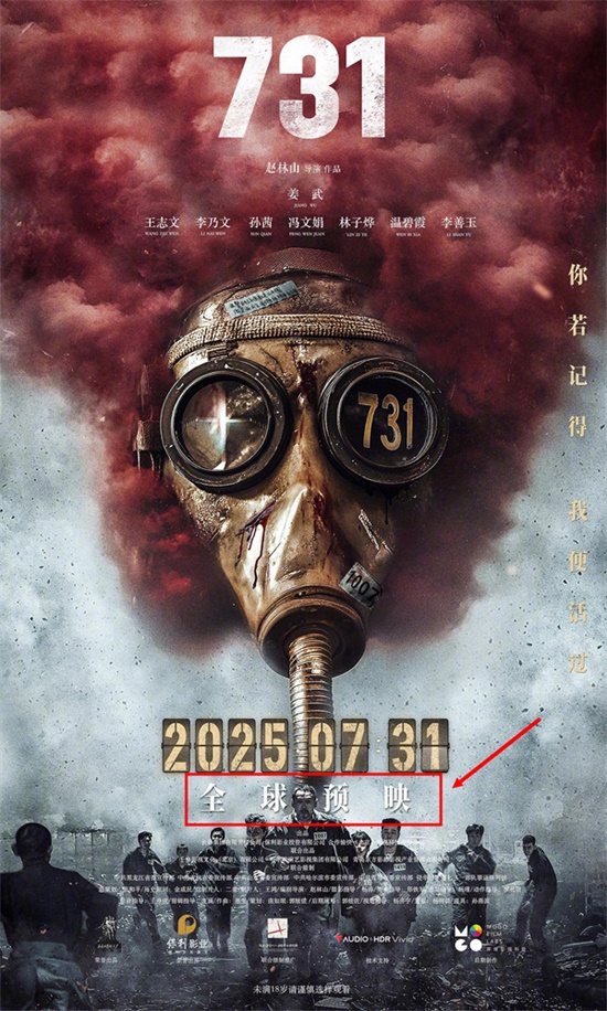 但实际上,这部电影在8月3日之前从来没有正式“定档”。此前一段时间,很多电影观众都在影院看到过《731》的贴片预告,但这个预告除了画面一侧写了一句“未满18周岁请谨慎选择观看”之外,并没有任何电影上映时间的明确信息。有细心的网友发现,目前为止电影释出的所有预告片与海报都没有使用“定档”“点映”“上映”“公映”这样的表述,而是一个大家比较陌生的概念——7月31日“全球预映”。