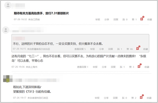 传言2:《731》电影不能上映是因为接到了大量投诉