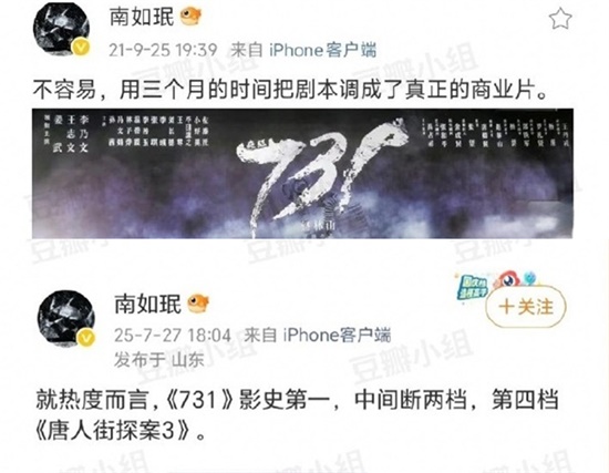 微博上据称是《731》电影策划的@南如珉也曾发表过“就热度而言, 《731》影史第一”“不容易,用三个月时间把剧本调成了真正的商业片”等引发争议的言论。