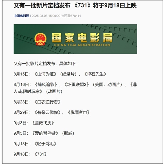 新潮观鱼询问了江苏某影城经理,他表示“《731》原本确实是计划7月31日上映的,发行方的周边都设计好了,就等制作了。”他还透露,大约半个月前发行方征集过主题影城,有800多家影城报名并制作了相关物料。