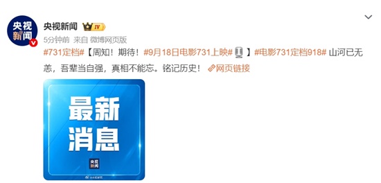 8月3日,央视新闻发布了电影《731》定档的消息,半个多月来围绕着《731》“消失”的种种猜测暂时有了一个明确的说法,各大媒体也接着“官宣定档”表达了对电影的期待。《731》电影官方微博也发布了一条“简洁”的定档海报呼应这一消息。
