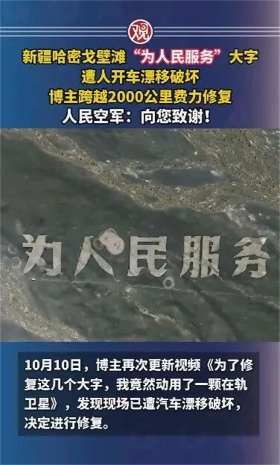 在新疆哈密辽阔的戈壁滩上,静静矗立着一组用白色石块拼成的巨型标语——“为人民服务”、“只争朝夕”。