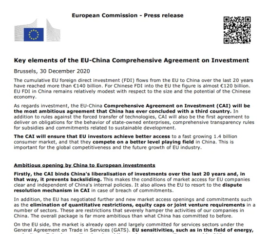 As regards investment, the EU-China Comprehensive Agreement on Investment (CAI) will be the most ambitious agreement that China has ever concluded with a third country. In addition to rules against the forced transfer of technologies, CAI will also be the first agreement to deliver on obligations for the behavior of state-owned enterprises, comprehensive transparency rules for subsidies and commitments related to sustainable development.