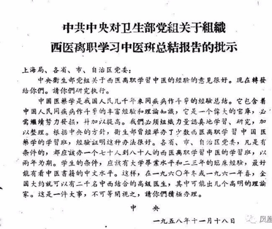 1958年10月11日,毛泽东在对卫生部党组《关于西医学中医离职学习班的总结报告》的批示中指出:“中国医药学是一个伟大的宝库,应当努力发掘,加以提高。”