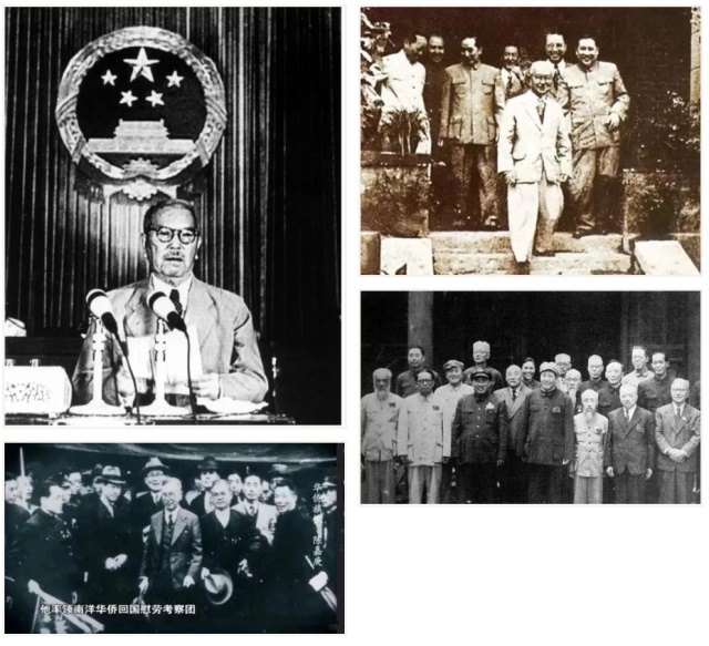 1949年9月21日,中国人民政治协商会议第一届全体会议开幕。陈嘉庚在24日的大会上发言,他对大会通过三个草案“表示完全接受和极力拥护”。大会选举时,陈嘉庚、司徒美堂等6位华侨代表被选为政协第一届全国委员会委员,陈嘉庚还被选为政协常务委员,后任副主席。1949年10月1日,庄严的开国大典仪式上,陈嘉庚和600多名政协代表应邀登上天安门城楼,检阅游行队伍。