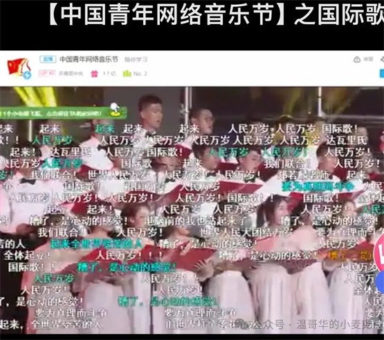 当中国青年网络音乐节进行到最高潮时,全场青年高唱国际歌,弹幕上也写满了毛主席的那句名言“人民万岁”……