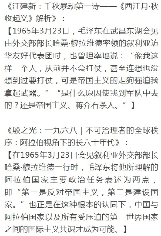 根据《毛泽东年谱》记载,1965年3月23日下午,在武昌东湖客舍,毛主席会见了由外交部部长哈桑·穆拉维德率领的叙利亚访华友好代表团。在询问了叙利亚等阿拉伯国家的情况后,毛主席指出: