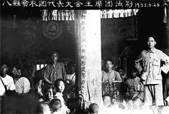 1933年6月26日,中央苏区八县贫农团代表大会主席团合影。右一为毛泽东。