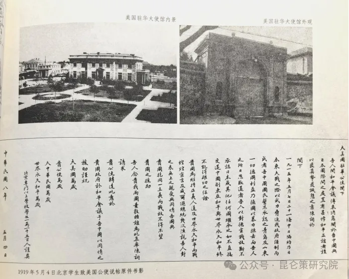 堵在这里怎么办啊?当时他们带头的青年代表罗家伦等四人,他们给美国大使要递一封《说贴》,大家看一看,就是这个恭恭敬敬地说:“大美国驻华公使阁下......”,就请求美国主持公道啊。