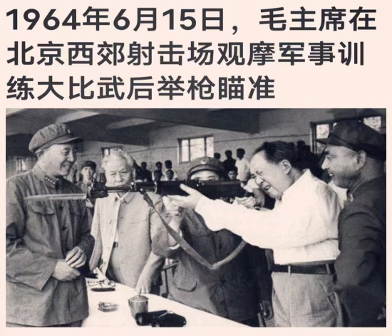 1964年6月16日下午毛主席和刘少奇、董必武、朱德、周恩来等先后在北京十三陵水库、羊坊继续观看北京部队、济南部队的汇报表演,包括反空降、设置水陆障碍、炮兵和坦克部队的表演。