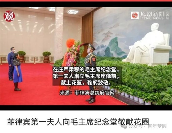 凤凰卫视披露,2023年1月6日,菲律宾总统马科斯访华,总统夫人代表总统夫妇瞻仰了毛主席纪念堂。在庄严肃穆的毛主席纪念堂,第一夫人肃立在毛主席坐像前献上花篮,鞠躬致敬,表达对毛主席的敬意。