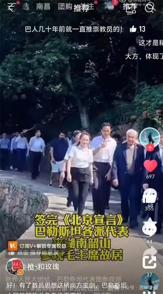 个媒披露,2024年7月21日至23日,巴勒斯坦 14 个派别高级别代表在北京举行和解对话,签完《北京宣言》,各派代表就来到韶山参观毛主席故居,祭拜毛主席。