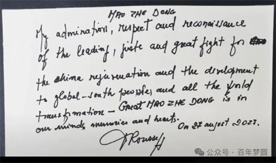 罗塞芙在了却多年“赴韶山祭拜毛主席”的心愿后,在现场即席题词:“毛泽东,谨此致以崇高的敬意与深切的缅怀。我们向这位引领中国复兴、推动全球青年发展、促进世界变革的伟大领袖致敬。他的卓越成就将永远铭刻于我们的记忆与心中。”
