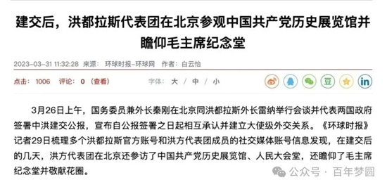 《环球时报》记者披露,2023年3月26日,洪都拉斯外长雷纳率代表团与中国外交部在北京进行建交会谈,宣布自公布签署之日起,相互承认并建立大使级外交关系。在与中国建交后的几天中,参观了中国共产党历史展览馆、人民大会堂,瞻仰了毛主席纪念堂,并敬献了花圈。
