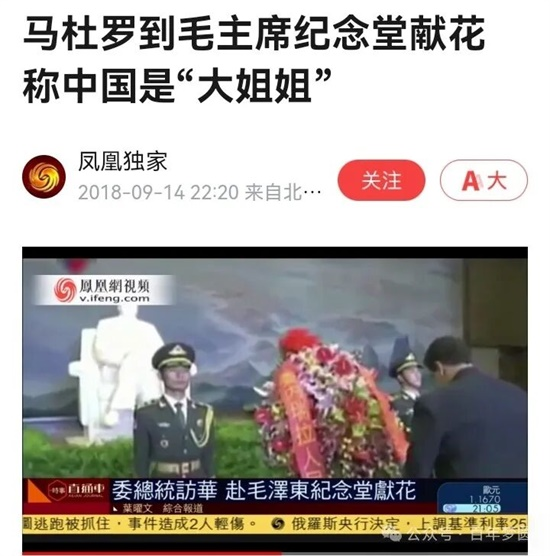 凤凰网披露,2018年9月14日,委内瑞拉总统马杜罗访华,携同夫人到毛主席纪念堂祭拜了毛主席。马杜罗表示,这是他第一次来到纪念堂,悼念这位伟大的建国者,对此深受感动。