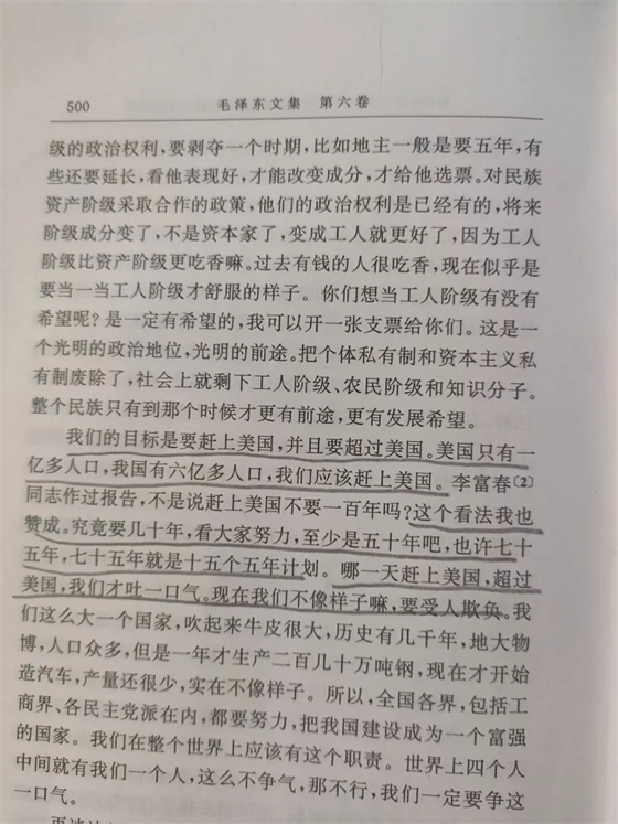 “我们的目标是要赶上美国,并且要超过美国。美国只有一亿多人口,我国有六亿多人口,我们应该赶上美国。李富春同志作过报告,不是说赶上美国不要一百年吗?这个看法我也赞成。究竟要几十年,看大家努力,至少是五十年吧,也许是七十年,七十年就是十五个五年计划。哪一天赶上美国,超过美国,我们才吐一口气。现在我们不像样子嘛,要受人欺负。”——《毛泽东文集》第6卷,第500页,人民出版社1999年版