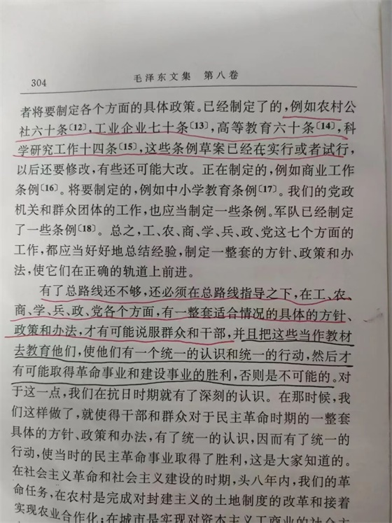 “有了总路线还不够,还必须在总路线指导之下,在工、农、商、学、兵、政、党各个方面,有一整套适合情况的具体的方针、政策和办法,才有可能说服群众和干部,并且把这些当作教材去教员他们,使他们有一个统一的认识和统一的行动,然后才有可能取得革命事业和建设事业的胜利,否则是不可能的。”——《毛泽东文集》第8卷,第304页,人民出版社1999年版