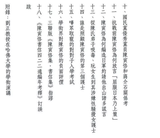 反观作为历史学家的陈寅恪,没有写过通史,也没有写过断代史,其《隋唐制度渊源论稿》与《唐代政治史述论稿》,不过是其长年授课讲稿,充其量不过是个“专题史”,基本上是史料堆积。特别是在1949年以后,他仅写了一部书评《论再生缘》(系文学评论著作,同史学根本挨不上边);另外,为妓女立了一个传《柳如是别传》,仅此而已。(且是在助手们的帮助下完成的!)即使是他的三本最主要的历史学术著作——“唐史三书”(《隋唐制度渊源略论稿》、《唐代政治史述论稿》、《元白诗笺证稿》),亦非什么史学界公认高质量的“权威”著作。仅被同校另一位隋唐史专家岑仲勉(岑长陈四岁,1948年起同为中山大学历史系教授,1961年病逝。岑氏留下《隋唐史》等专著达19种,论文200篇,共计近1000多万字,堪称“著作等身”!)提出的质疑、商榷之处就达七、八十处之多!