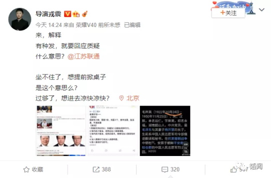 知名博主@导演戎震 发帖指出:来,解释。有种发,就要回应质疑什么意思?@江苏联通 坐不住了,想提前掀桌子,是这个意思么?过够了,想进去凉快凉快?