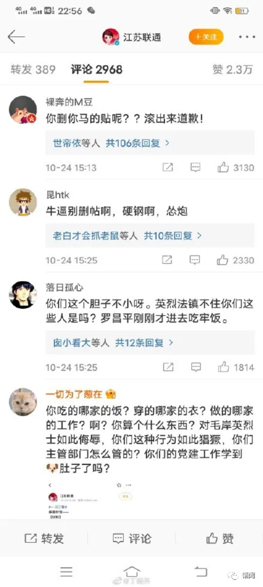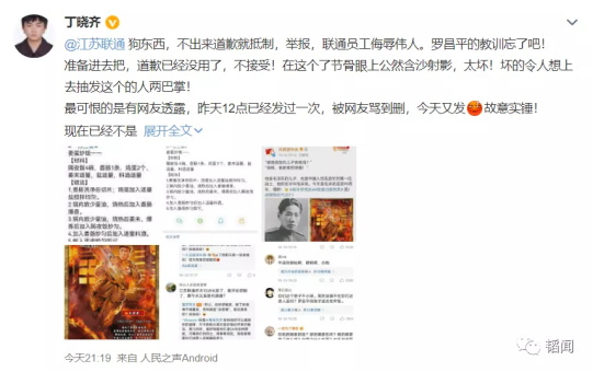 网民@丁晓齐 发帖愤怒的指出:@江苏联通 狗东西,不出来道歉就抵制,举报,联通员工侮辱伟人。罗昌平的教训忘了吧!准备进去把,道歉已经没用了,不接受!在这个了节骨眼上公然含沙射影,太坏!坏的令人想上去抽发这个的人两巴掌!