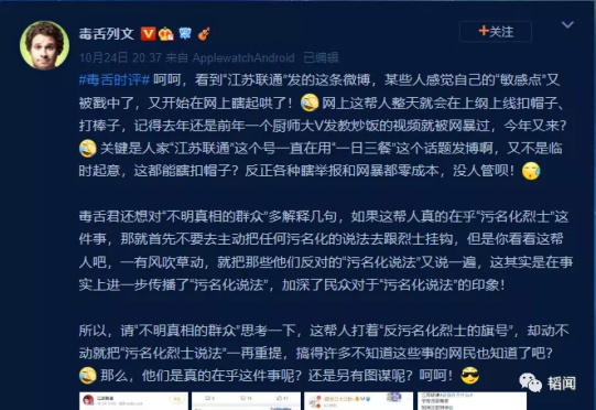 令人意外的是,如此侮辱烈士的行为,居然立即有大V跳出来洗地,不但是信口雌黄,还攻击网民是上纲上线、瞎起哄、扣帽子、打棒子。