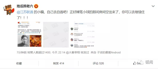 知名博主@地瓜熊老六 发帖:@江苏联通 的小编,自己去自首吧!正好辣笔小球的那间房间空出来了,你可以去继续住了!!!