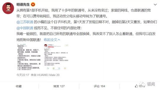知名博主@明德先生 由指出:@江苏联通 的小编在这个日子抖机灵,第1天发了发现日期不对,删掉后第2天又重发,如果你们@中国联通 视而不见,不做任何的内部处理:我唯一能做的,就是把自己所有的联通号全部换掉,我改变不了别人怎么看联通,但我可以自发地抵制中国联通!
