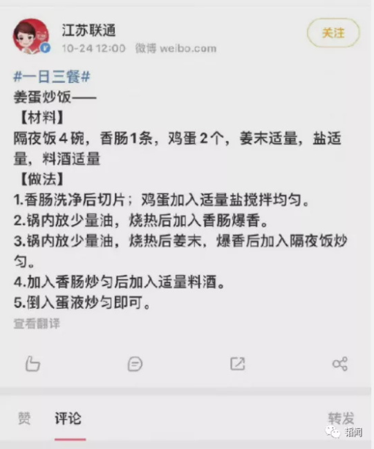 昨天中午12时,江苏联通的官微发了一条微博,玩儿起了“蛋炒饭”。记着,昨天这个日期的特殊性。