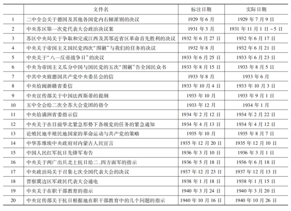 第一,《六大以来》出现文件日期标注错误是一个普遍性问题。经核对,该书共有20处日期错误,列表如下: