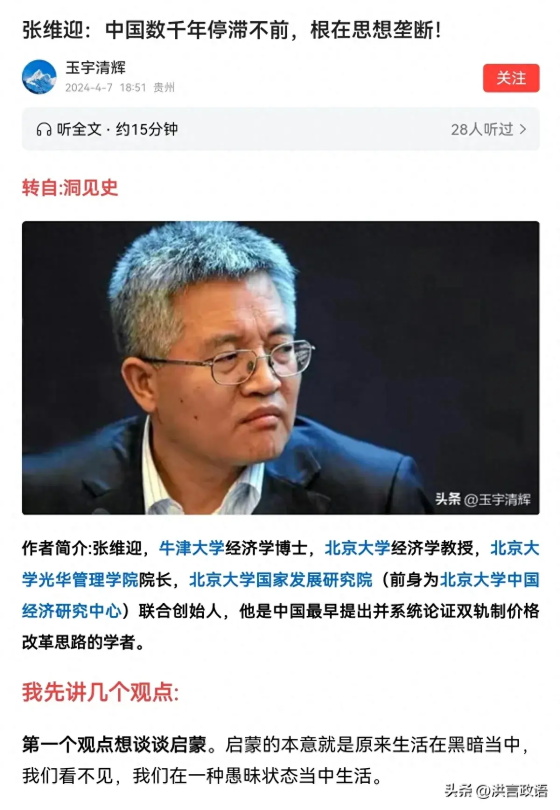 今天刷屏看到了一个网名叫“玉宇清辉”的人转发《洞见史》的一篇文章,标题是:张维迎:中国数千年停滞不前,根在思想垄断。阐述了张维迎关于思想和启蒙等一些观点。看后,有一种莫名的感觉,忍不住想说说自己的一些看法。