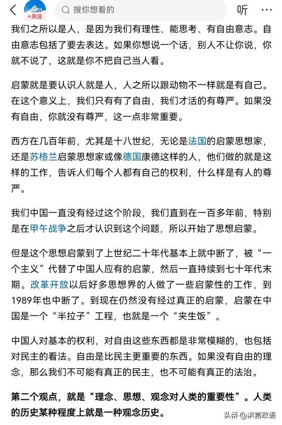 对于他的这个观点我认为有两点是必须要搞清楚的,一是究竟什么叫思想“启蒙”。二是应该要弄清楚什么是“自由”、“权利”和“民主”与“法治”等的基本概念。
