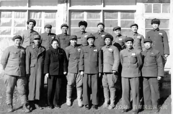 1953年10月,第三届中国人民赴朝慰问团总团长贺龙率领慰问团到朝鲜慰问志愿军,后排左四为贺龙,前排左三为康克清,前排右三为军长吴咏湘。(照片取自网络)